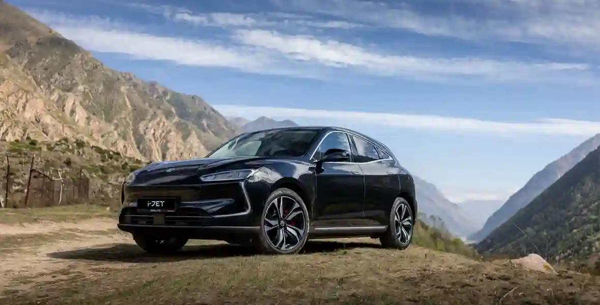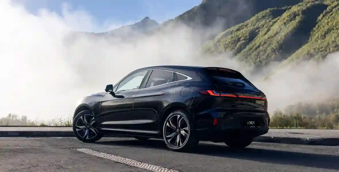 Формой кузова EVOLUTE i‑JET напоминает о Porsche Macan — особенно похожа задняя часть, где с немецким спортивным кроссовером его роднят не только светодиодные фонари во всю ширину, но и расположенная на креплении стеклоочистителя кнопка открывания двери багажника.