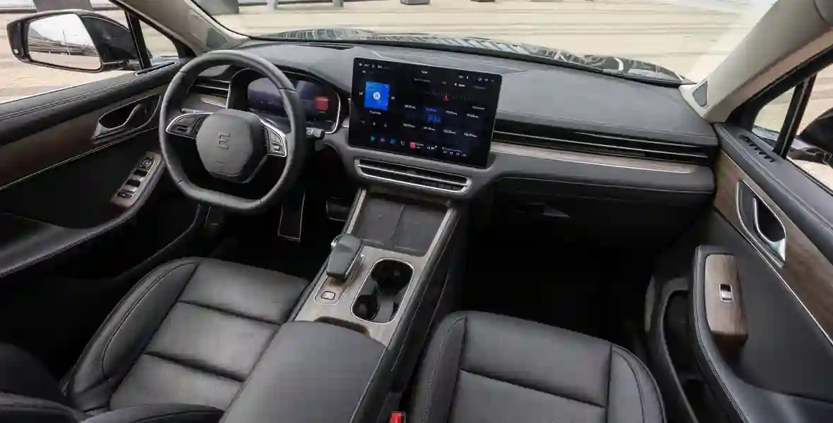 Если Seres Aito M5 имеет гибридную силовую установку, то EVOLUTE i‑JET — полностью электрический. В салоне можно долго искать кнопку, которая «включает» машину, потому что… её здесь нет. Чтобы кроссовер «проснулся», нужно лишь нажать на педаль тормоза. Но сидеть все так же удобно, перед глазами — информативный экран приборного щитка с качественной русификацией, а на центральной консоли — огромный «телевизор» для управления всеми системами электромобиля.